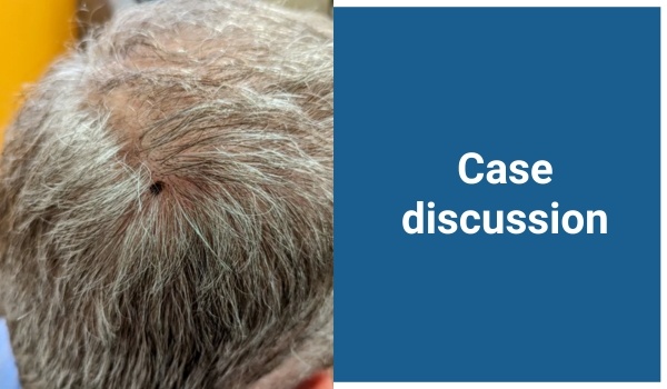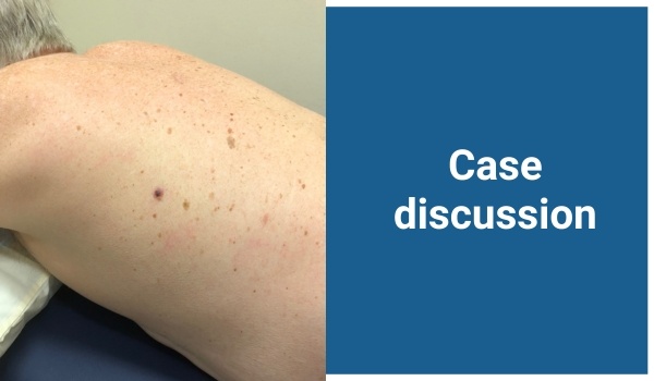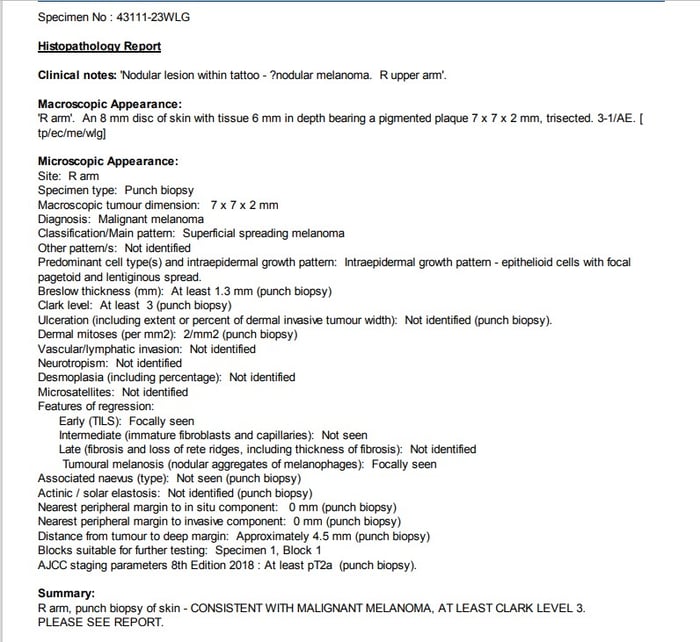 A 42-year-old attends for a skin check because his mom has been diagnosed with melanoma. This long-term nodular lesion is noted in a tattoo in his arm.